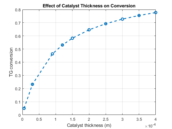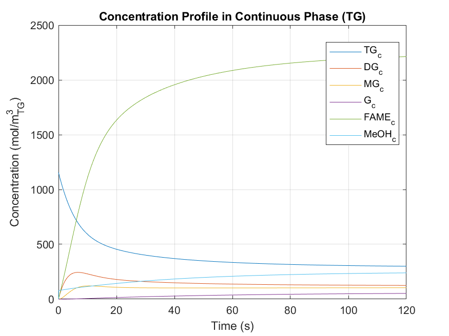 The homogeneous system models a two-phase transesterification reaction catalyzed by NaOH in methanol, dispersed within triglyceride-rich oil. The simulation captures phase-specific reaction kinetics and mass transfer limitations. At 100 rad/s, the conversion reached 74%, with excess methanol shifting the system from diffusion-limited to kinetically driven performance.