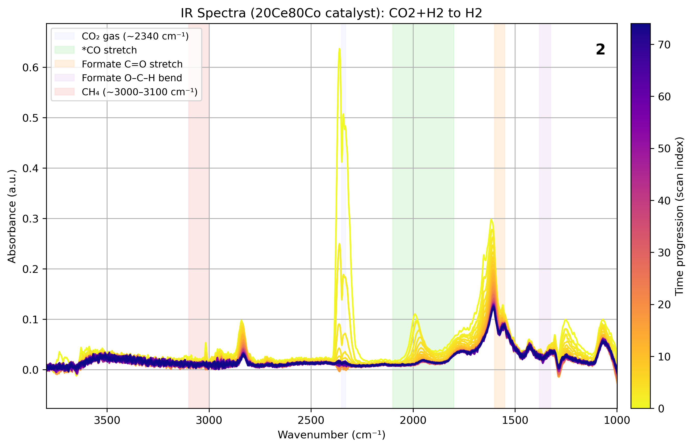 Results highlight ceria’s promotional role in cobalt dispersion, oxygen vacancy formation, and formate-mediated methanation. The 20Ce80Co catalyst exhibited the highest activity and CH₄ selectivity, with operando IR revealing a sequential CO₂ → CO → CH₄ pathway.